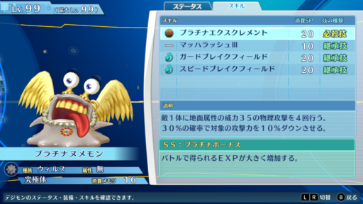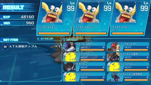 1. 中盤以降はパーティーのコストによるがプラチナヌメモンを作っていく。 プラチナヌメモンは究極体でかつ進化させやすい。サポートスキルのプラチナボーナスで1体につき経験値2倍になる。しかも装備枠も3つあり軍師のUSBを3つ装備できる破格の経験値マシンなので、積極的に育てていく。プラチナヌメモン×3、軍師のUSB×9で経験値が40倍にもなるのでレベル上げ・デジモン育成には欠かせない存在である。